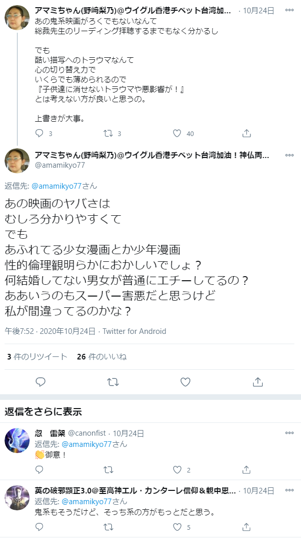 ただし今後もこの評価が続くかどうかは微妙ではある。HSでは、相当にマイペースで個性的な人でない限りは、大川隆法と教団の見解に合わせるのが普通なので、この方々もじきに「鬼滅の刃」について辛い評価をくだすようになるやもしれぬ。